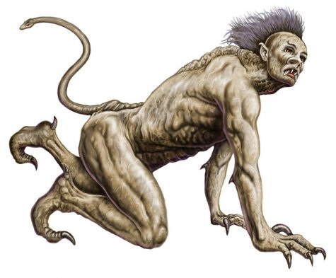 representaciones: como un humanoide con aspecto vampírico, colmillos largos, garras afiladas, piernas muy largas, cola larga en forma serpentina, cabello largo
