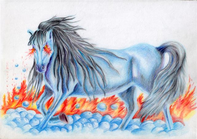 representaciones: un potro negruzco de cola negra y largas crines que echa espuma por la boca y fuego por los ojos.