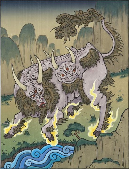 representaciones: como una bestia con cuerpo de vaca y ojos en su lomo; a veces con nueve ojos y seis cuernos, o con cuerpo de león. En ocasiones con cabeza humana