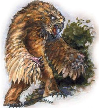 representaciones: como un búho gigante, con pelaje grisáceo en lugar de plumas, alas extensas, espolones afilados en sus hombros, garras grandes, cola copetuda. También como un híbrido entre humano y pájaro