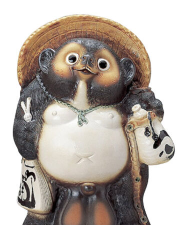 representaciones: en forma de mapache grande con una botella de sake, un kimono, un sombrero de paja y sus grandes chacaras (huevos de oro). A veces se lo representa con la hoja mágica, cara sonriente, barriga amplia y los ojos muy abiertos.